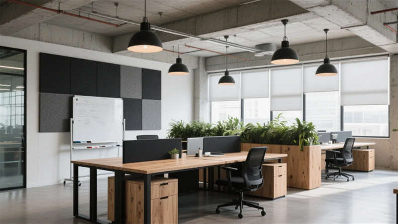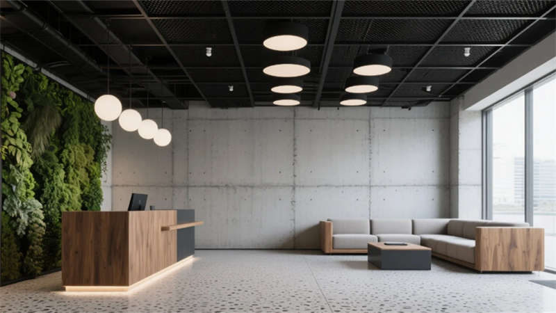 步入大堂,粗獷的混凝土墻面與水磨石地面形成質感對話,懸浮金屬網(wǎng)天花下,原木前臺與背光綠植墻暈染出溫潤生命力。開放式辦公區(qū)延續(xù)工業(yè)基調,模塊化橡木桌搭配黑色鋼架,綠植隔斷巧妙劃分空間,自然光穿過智能遮陽簾,在混凝土天花上投下流動的光影詩行。