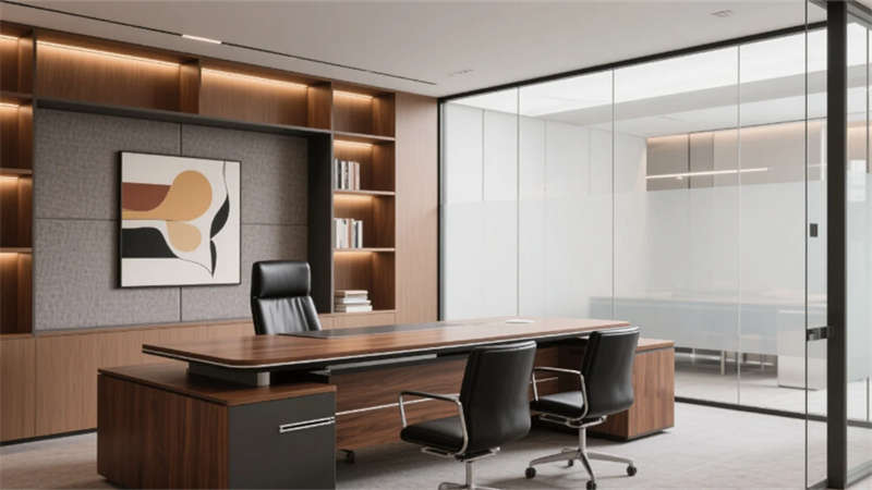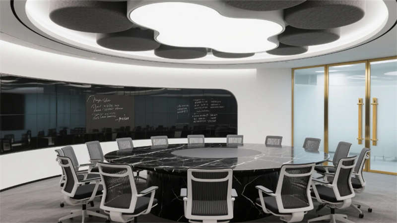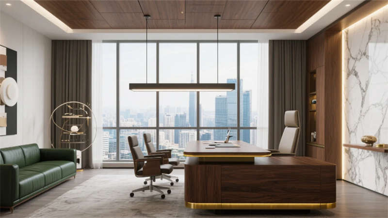 私密空間演繹克制的精致:經(jīng)理辦公室玻璃隔斷內(nèi),胡桃木書桌與毛氈吸音墻平衡理性與溫度;總裁套間則以大理石暗光墻面對話城市天際線,黃銅細節(jié)點亮低調的尊崇。會議室黑石長桌與磁吸玻璃書寫面碰撞靈感,而公共休息區(qū)陶土花盆與橄欖綠軟墊,在混凝土中島上生長出松弛的煙火氣。