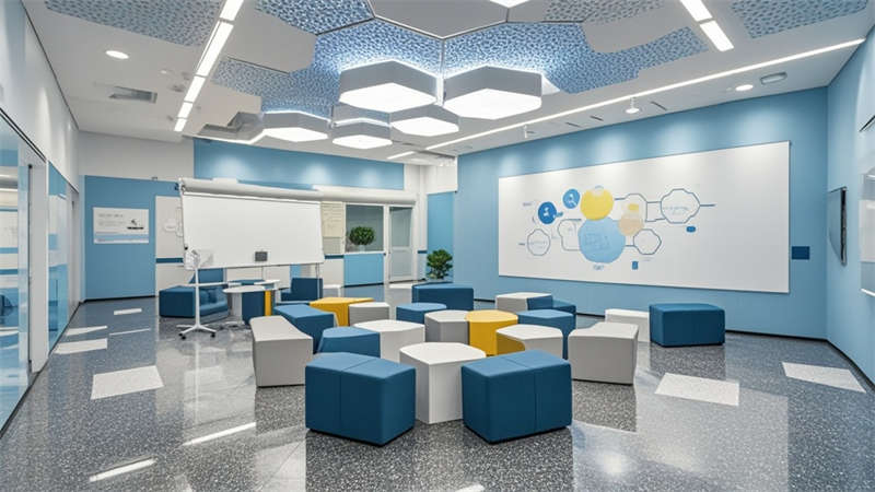 本1500㎡現(xiàn)代簡約辦公室設(shè)計(jì)以'高效協(xié)作·人文關(guān)懷'為核心,采用模塊化空間布局提升使用彈性。主色調(diào)選用淺灰、白、木三色系,局部點(diǎn)綴企業(yè)深藍(lán)色強(qiáng)化品牌認(rèn)知。開放式辦公區(qū)采用1.2m×1.8m標(biāo)準(zhǔn)工位模塊,通過玻璃隔斷實(shí)現(xiàn)90%自然光滲透率。智能照明系統(tǒng)根據(jù)日照強(qiáng)度自動(dòng)調(diào)節(jié)色溫,全年節(jié)電率達(dá)35%。核心筒改造區(qū)運(yùn)用曲面木飾面弱化建筑結(jié)構(gòu),形成自然交流節(jié)點(diǎn)。聲學(xué)設(shè)計(jì)方面,蜂窩吸音板(NRC 0.85)與隔音艙(STC 52)組合控制噪音污染。茶水區(qū)采用磁吸軌道插座系統(tǒng),支持設(shè)備靈活接入。所有家具均符合WELL建筑標(biāo)準(zhǔn),辦公椅配備6向調(diào)節(jié)功能。通過BIM技術(shù)實(shí)現(xiàn)管線綜合,保留3.2米凈高營造開闊感。