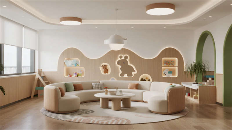 這座親子民宿以現(xiàn)代簡(jiǎn)約美學(xué)為靈魂,將自然元素與童趣設(shè)計(jì)無(wú)縫銜接??臻g摒棄繁復(fù)裝飾,選用淺木、純白與低飽和色彩鋪陳,弧形線條與柔和光影交織,營(yíng)造出寧?kù)o而溫暖的氛圍。從大堂的嵌入式動(dòng)物燈箱到套房的樹(shù)屋床鋪,每一處細(xì)節(jié)都暗藏親子互動(dòng)巧思,安全圓角家具與軟包地臺(tái)呵護(hù)孩童探索的每一步。