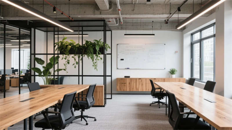 該辦公空間以暖調(diào)輕工業(yè)風(fēng)為靈魂,將冷峻的金屬骨架與溫潤的竹木元素交織,在微水泥的灰調(diào)基底上鋪陳出理性與感性的平衡。開放辦公區(qū)借落地窗引光入室,綠植墻與軌道燈串聯(lián)起流動的協(xié)作場景;獨立專注艙與水吧區(qū)形成動靜分區(qū),滿足深度思考與即時社交的雙重需求。