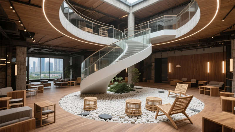 開放式核心區(qū)采用模塊化家具系統(tǒng),配合智能照明與聲學優(yōu)化,兼顧協(xié)作效率與專注需求;階梯沙龍與透明會議盒子激發(fā)即興創(chuàng)新,可移動隔斷實現(xiàn)場景自由切換。最具特色的是貫穿三層的垂直生態(tài)中庭,旋轉(zhuǎn)樓梯纏繞常綠藤蔓,成為連接空間的活力紐帶。