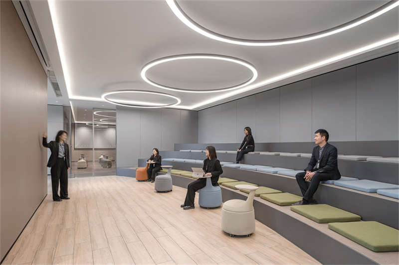 以高效私密和開放交流為光譜的兩軸,設(shè)計團隊設(shè)計了完全私密的電話亭,部分私密的玻璃盒子辦公區(qū),半開放的格柵盒子辦公區(qū),以及完全打開鼓勵交流的開放式辦公區(qū)。不同尺度,不同開放度的辦公區(qū),為所有員工提供了包容、公平、有彈性、可持續(xù)和健康的工作空間,社恐與社牛,各得其所。
