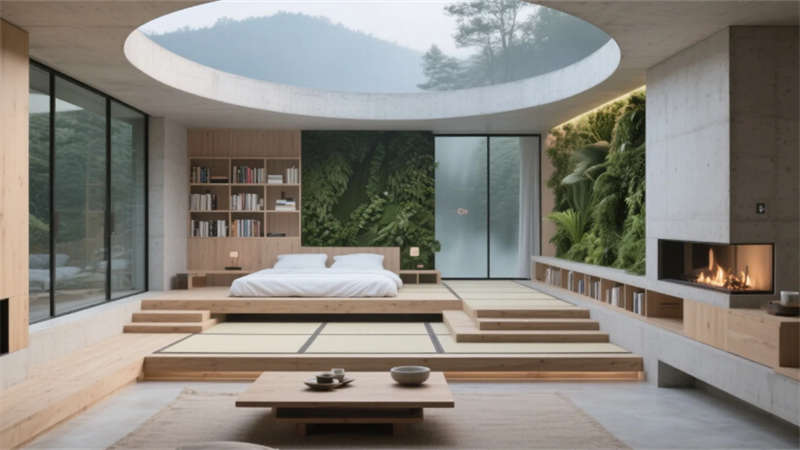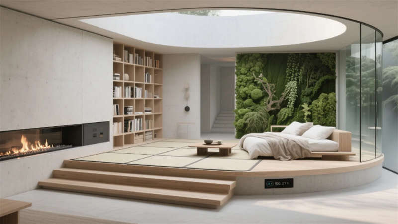 客房以極簡的智慧回應(yīng)棲居本質(zhì)。榻榻米地臺消弭床與地面的界限,270°環(huán)景霧化玻璃輕觸即透,仿生綠植在智能光影中呼吸生長,隱藏式投影幕布落下時,星空與林海皆成私享背景。階梯書吧的垂直綠植墻下,模塊化沙發(fā)隨需求自由組合,全息粒子在空氣中勾勒出流動的藝術(shù),而巖板中島餐廳里,藤編座椅與吊燈矩陣的光暈交織,智能調(diào)光天窗讓每一餐都浸染著天光的溫度。