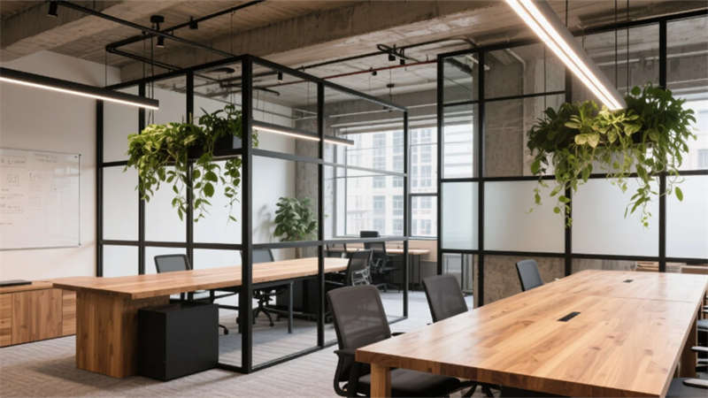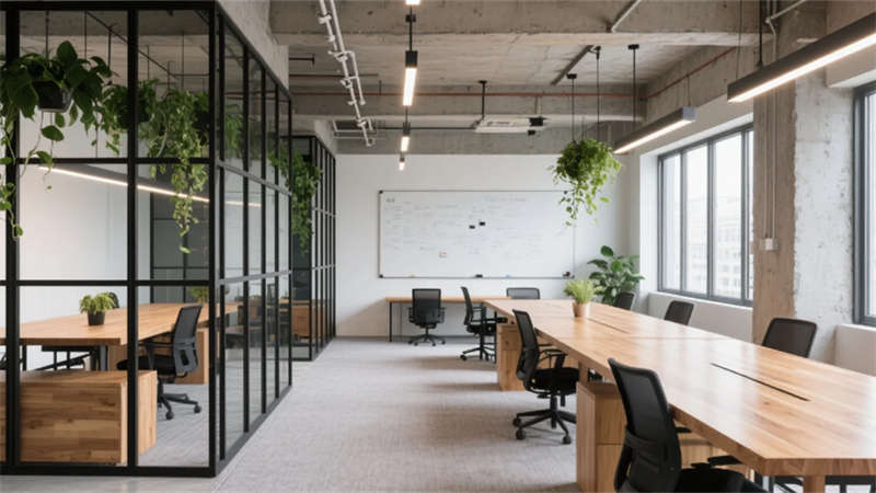 該辦公空間以暖調(diào)輕工業(yè)風(fēng)為靈魂,將冷峻的金屬骨架與溫潤的竹木元素交織,在微水泥的灰調(diào)基底上鋪陳出理性與感性的平衡。開放辦公區(qū)借落地窗引光入室,綠植墻與軌道燈串聯(lián)起流動的協(xié)作場景;獨立專注艙與水吧區(qū)形成動靜分區(qū),滿足深度思考與即時社交的雙重需求。
