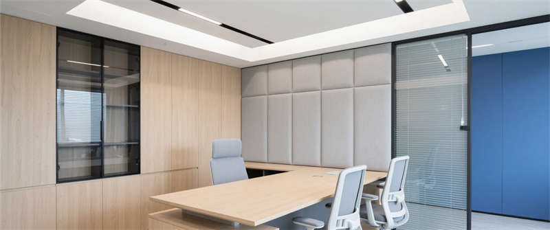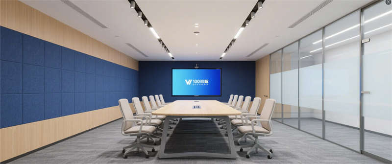 智能會議室:深藍色吸音墻面呼應企業(yè)VI色,智能屏幕與玻璃隔斷凸顯科技屬性;