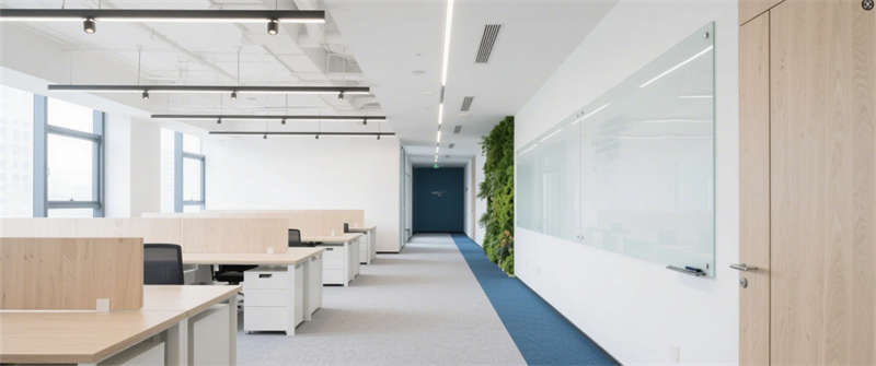 開放式辦公區(qū):北歐風工位搭配綠植墻,裸露天花軌道射燈兼顧實用與工業(yè)美感;