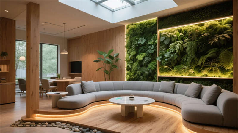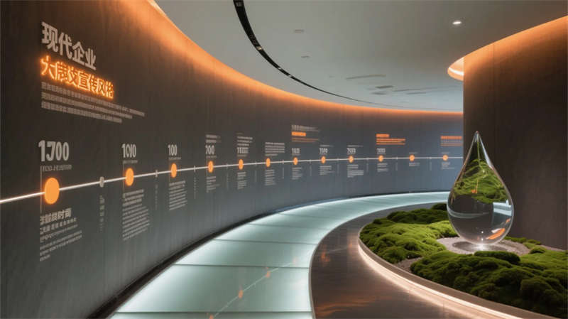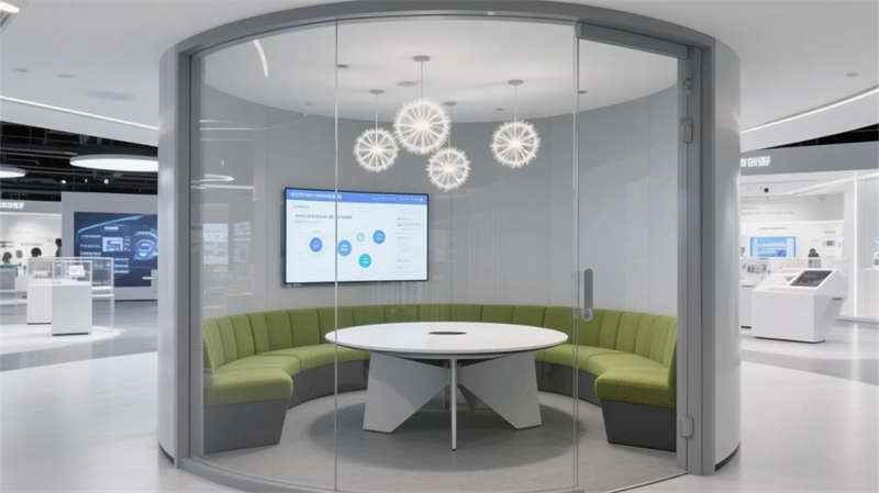 入口以光帶引導與生態(tài)綠墻開啟敘事,核心展區(qū)通過懸浮觸控與嵌入式展臺聚焦技術創(chuàng)新。數字沙盤區(qū)突破物理限制,以天地屏聯(lián)動呈現(xiàn)發(fā)展藍圖;智能會議艙可隨時轉化為協(xié)作中樞,通透隔斷維持空間對話性。文化長廊以光影步道承載企業(yè)精神,生態(tài)休憩區(qū)則借自然光影與苔蘚景觀構建減壓綠洲。